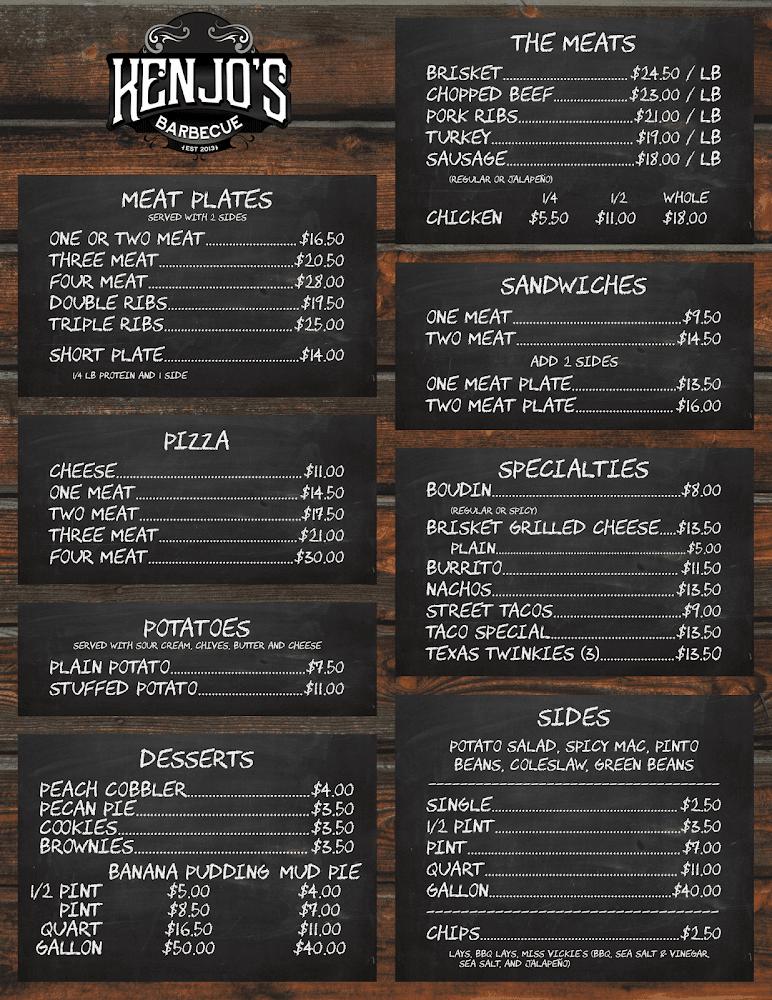 The menu at Kenjo's Barbecue offers a variety of smoked meats, sandwiches, and sides. Notable items include the one, two, and three meat plates featuring brisket, pork ribs, and sausage. Specialty dishes like the brisket burrito and jalapeño boudin add flair to the menu.